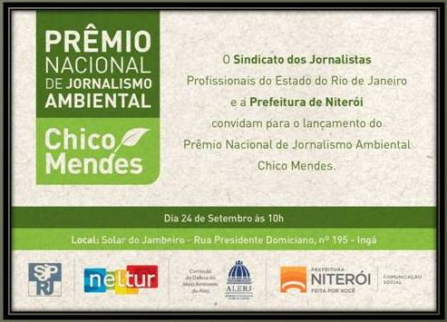 O Sindicato dos Jornalistas Profissionais do Estado do Rio de Janeiro e a Prefeitura de Niterói convidam para o lançamento do Prêmio Nacional de Jornalismo Ambiental Chico Mendes.