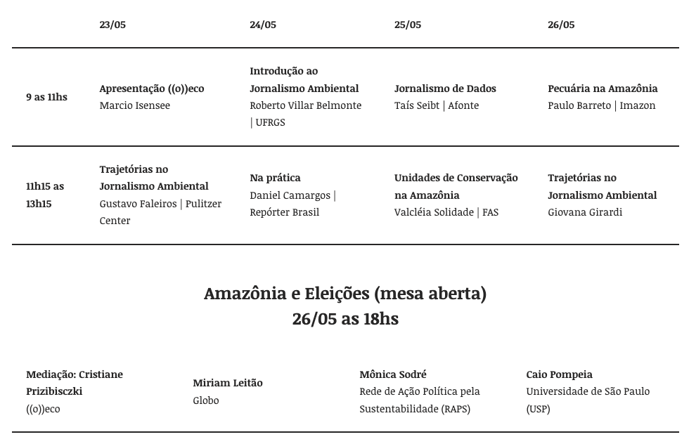 Como novidade desta edição, no último dia do curso, dia 26 de maio, às 18h, será realizada uma mesa aberta (transmitida via Youtube) com o tema Amazônia e Eleições, em que jornalistas e pesquisadores debaterão o tema.