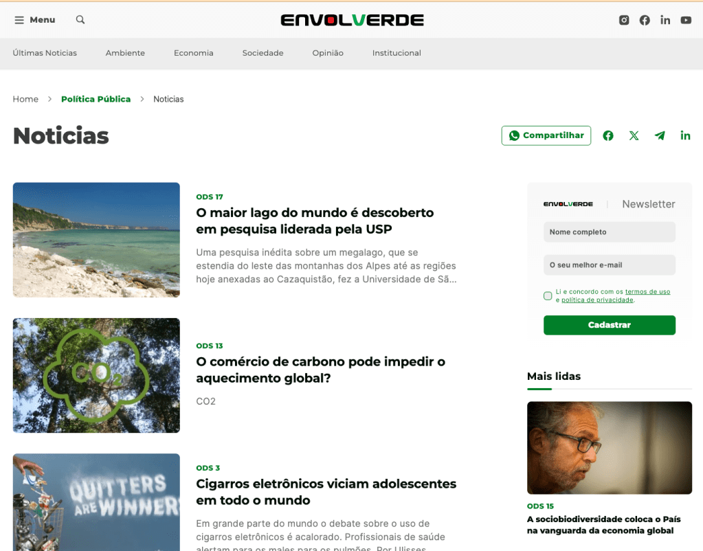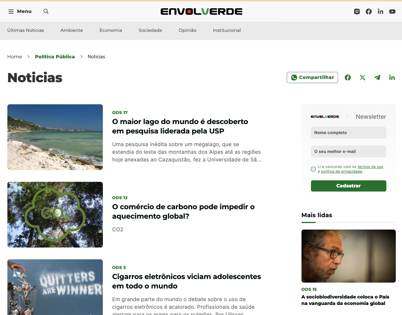 Uma das principais agências de jornalismo ambiental brasileiro, a Envolverde, está com um novo site de jornalismo. Foi todo renovado utilizando tecnologias mais modernas. O endereço continua em www.envolverde.com.br. A renovação atingiu também a estrutura editorial, agora focada em politicas publicas de meio ambiente, economia e sociedade, além de um espaço para a abordagem do tema governança — boas práticas de empresas e organizações sociais. Oficialmente, o lançamento do novo design ocorrerá em março/2024.